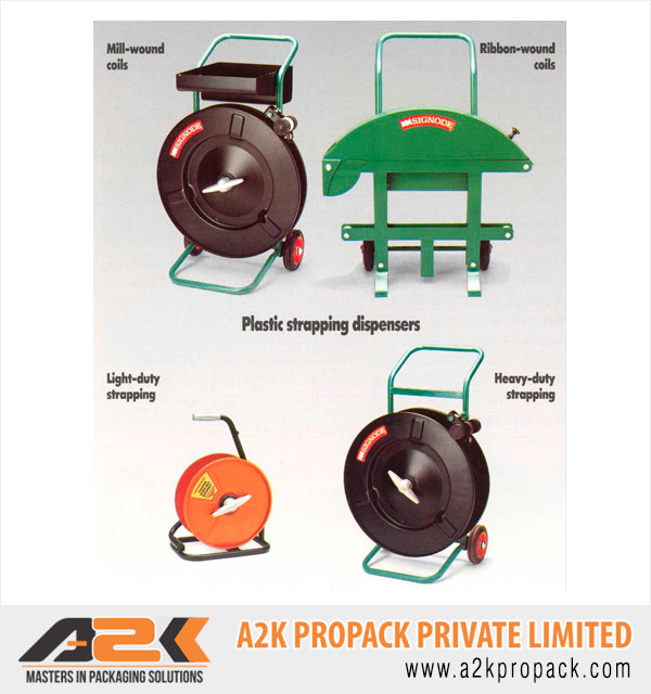 Strapping dispensers are required for efficient strapping operations when using manual tools or automatic machines. Depending on strap size and type, tooling customer plant layout and the product to be packaged, Signode India has the right dispenser for the job! Each dispenser accommodates a standard coil of mill-wound or a coil of ribbon-wound material. The operator pulls lightly on the strap-end and the strap is effortlessly paid-off from the dispenser. On most dispensers a set of strap guide rollers make strap pay-off easy and also act as strap over-run brake systems. Their heavy-duty and robust construction ensure a long dispenser working life even under the most severe conditions. The ergonomic design ensures an optimum working position and facilitates easy strap-coil reloading. Fixed and mobile models are available, with or without seal and tool trays for equipment storage when the tool is not in use. Dispensers can accommodate Signode India Apex® and Magnus® steel strapping.