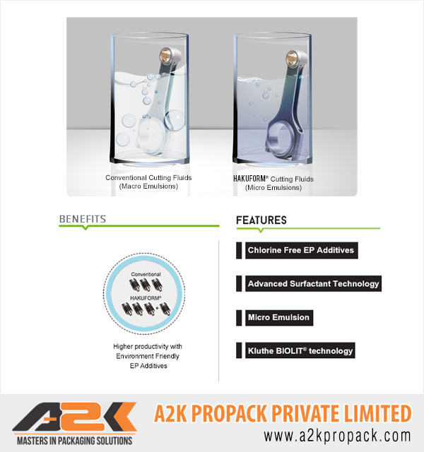 HAKUFORMⓇ Water Soluble cutting oils are formulated based on Chlorine Free Extreme Pressure additives, like esters that provide excellent tool life without compromising on environmental norms & risks associated with conventional chlorinated water soluble oils.