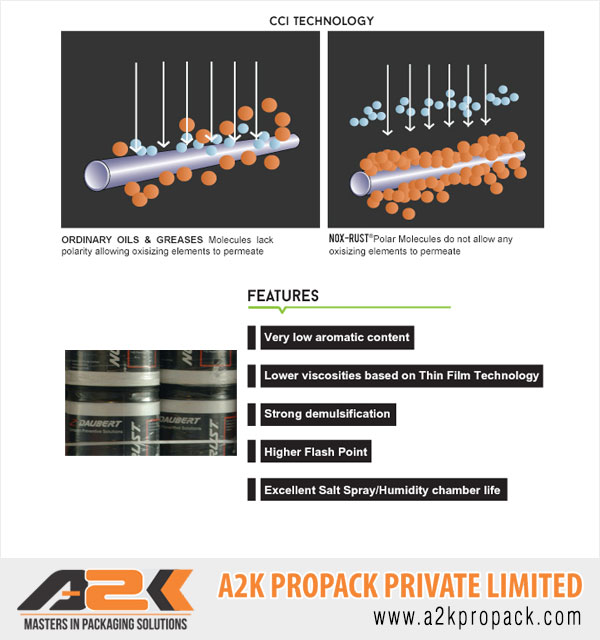 DAUBERT NOX-RUSTⓇ Rust Preventive oils are based on the CCI or Contact Corrosion Inhibition Technology. NOX-RUSTⓇ provides a range of specially formulated rust preventive oils giving excellent protection in areas of high humidity and temperature. NOX-RUSTⓇ oils provide significant cost & performance benefits over other poorly formulated rust preventive oils available in the market due to the thin film technology.